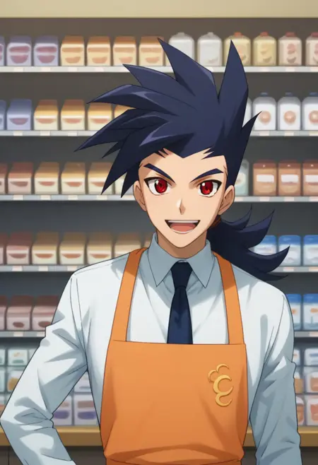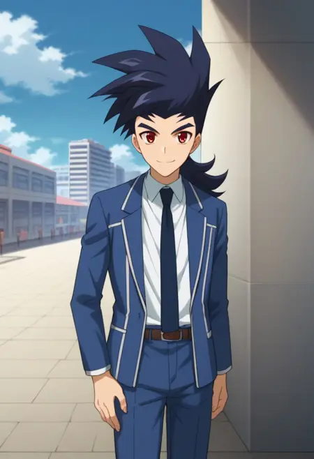 kamui, 1boy, male focus, necktie, spiked hair, ponytail, school uniform, red eyes, pants, blue pants, blue hair, jacket, blue jacket, open clothes, blue hair, open jacket, belt, shirt, white shirt,