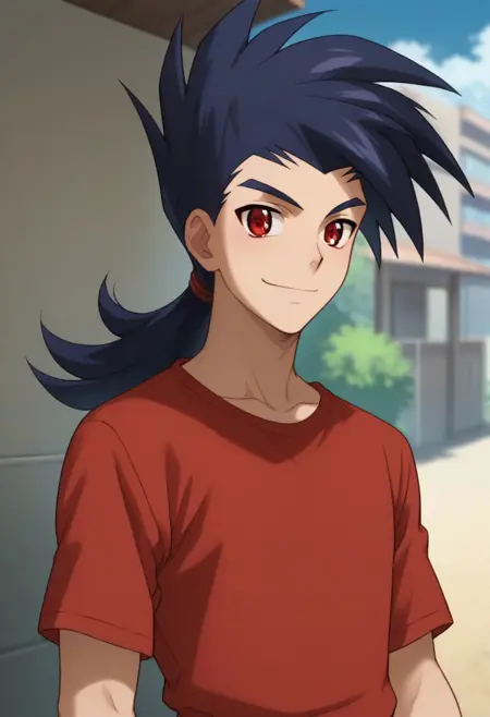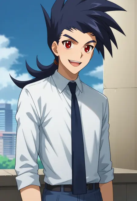 카무이, 1명의 소년, 남성 중심, 넥타이, 솔깃한 머리카락, 포니테일, 학교 유니폼, 붉은 눈, 바지, 파란 바지, 파란 머리, 재킷, 파란 재킷, 벌어진 옷, 파란 머리, 벌어진 재킷, 벨트, 셔츠, 흰색 셔츠,