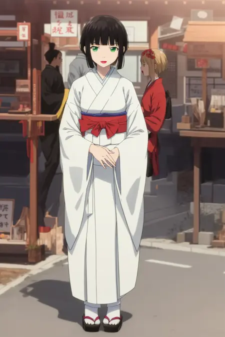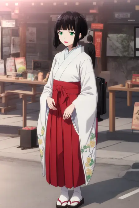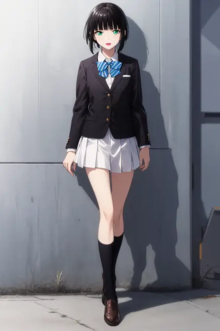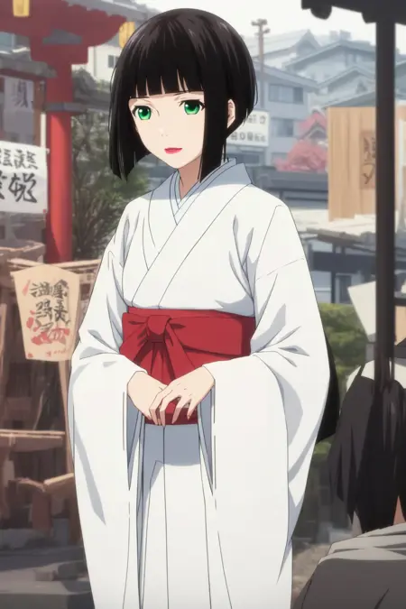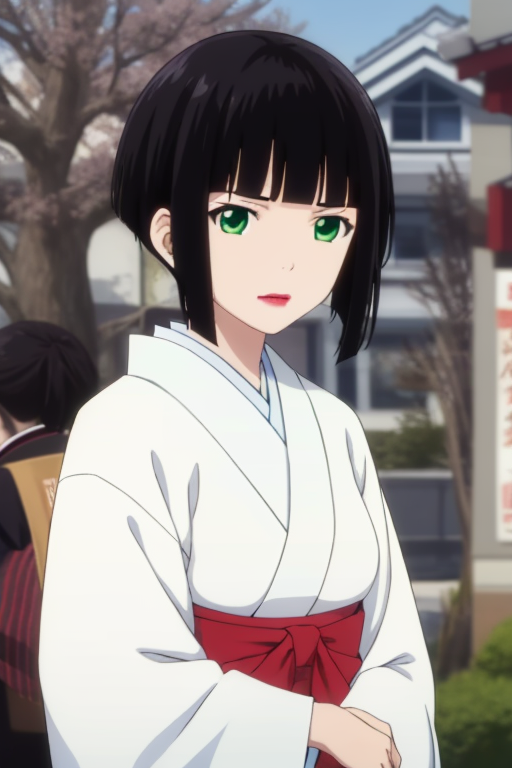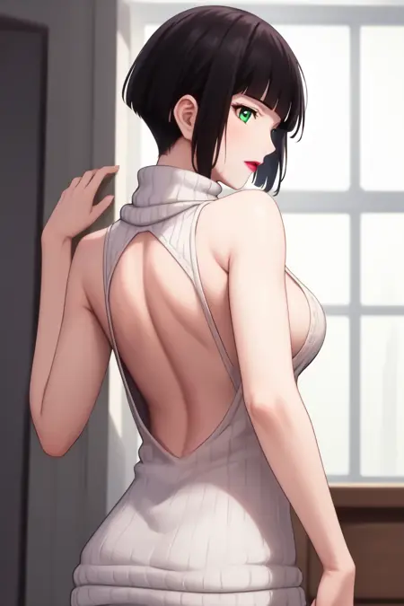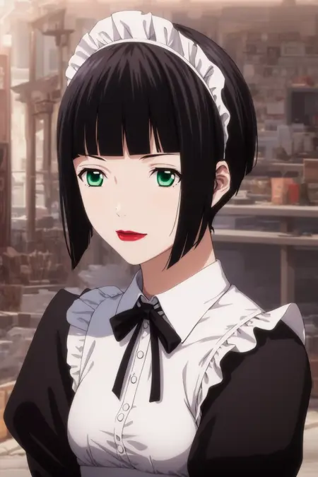 1girl, solo, mayu, black hair,green eyes, blunt bangs, short hair, lipstick,