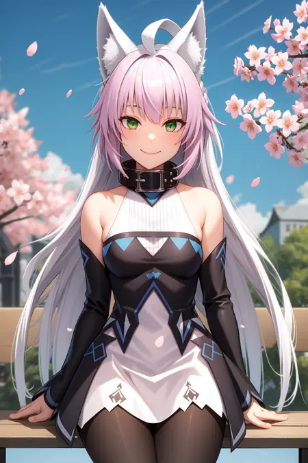 외모: 아탈란타, 녹색 눈, 좁아진 동공, 회색 머리, 긴 머리, 아호게, 동물 귀, 고양이 귀, 고양이 꼬리