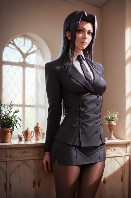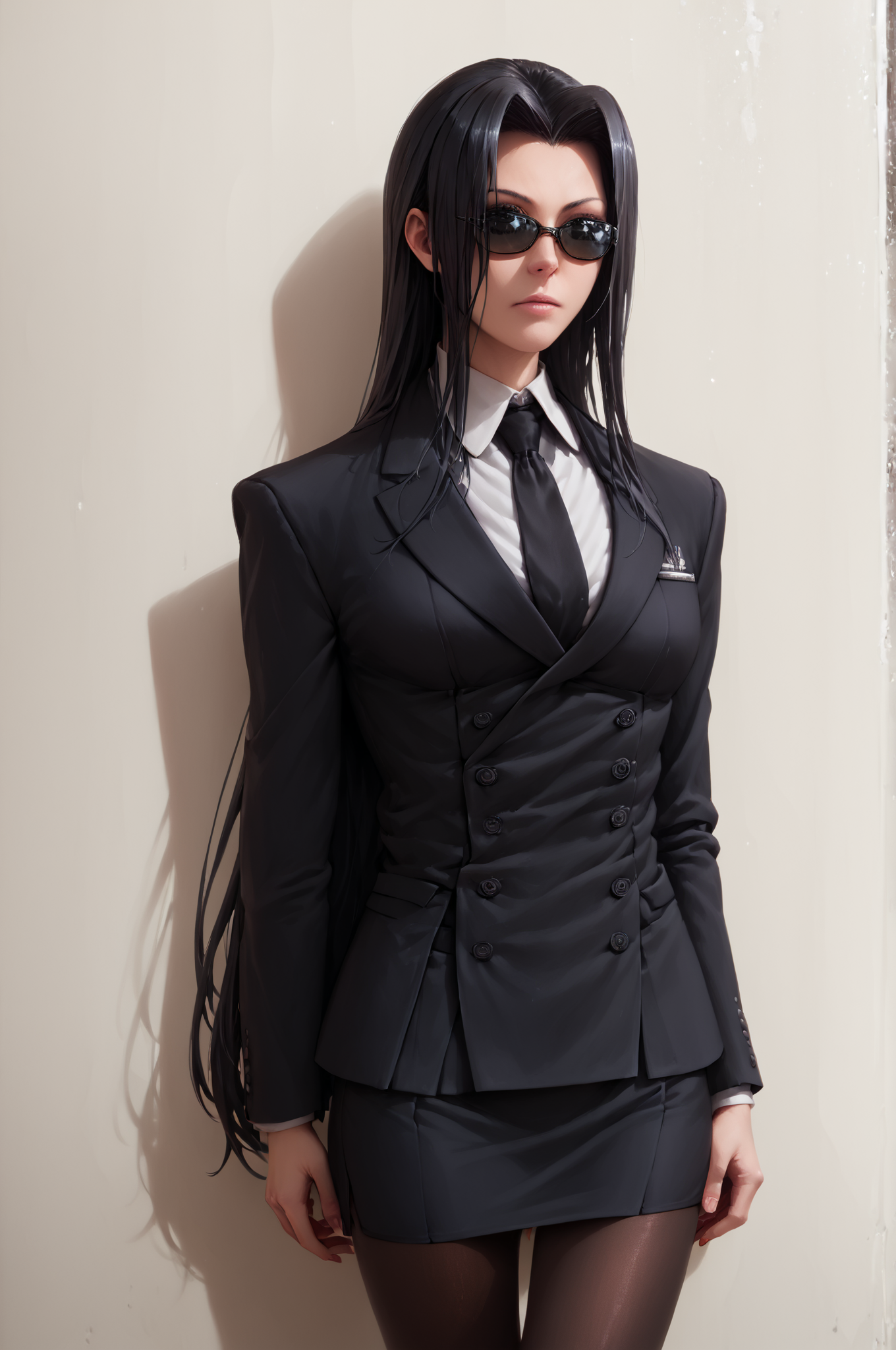 kuroko_smith, long_hair, solo, black_hair, sunglasses, skirt_suit, work_smith, pantyhose, double_breasted_blazer