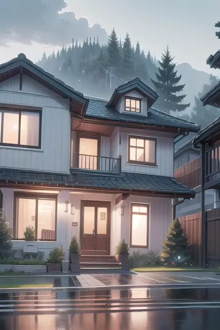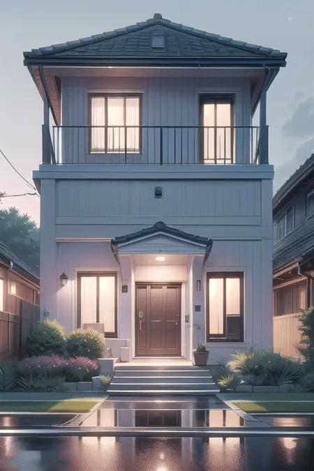 참고: 계단 난간이 자주 과도하게 자라나므로, Negative에 "(((railing)))"을 추가하세요. 젖은 도로를 원하지 않는다면 "wet"을 삭제하세요. (SD 1.5)