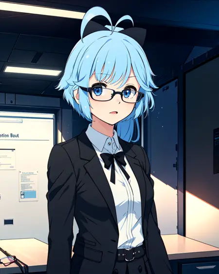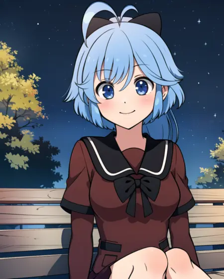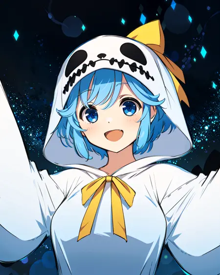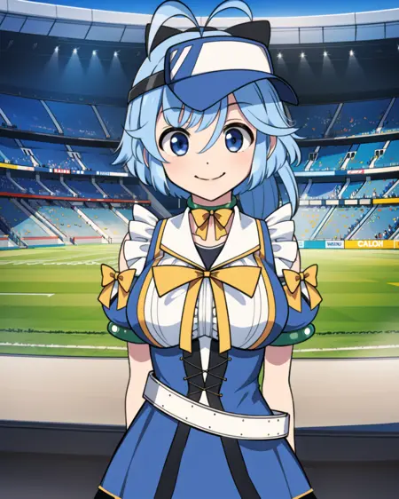 魔法少女衣装: mgrcutsuhonatsuki、ahoge、白いバイザー付き青い帽子、黄色いボウタイ、黒いボウヘアピン、白地に青のドレス、青地に黒のコルセット、緑のブレスレット、白いベルト、白い手袋、白いストライプの青いタイツ