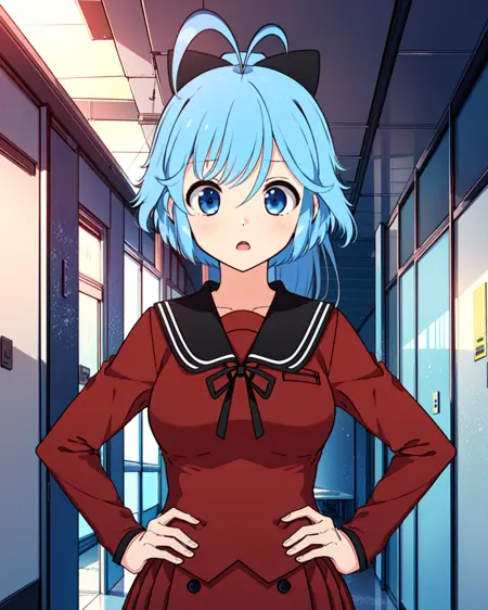 カジュアル衣装: mgrcutsuhonatsuki、ahoge、黒いボウヘアピン、赤地に黒のシャツ、長袖、赤ボタン付きスカート、黒いボウタイ、黒いタイツ