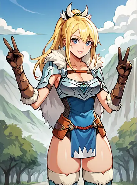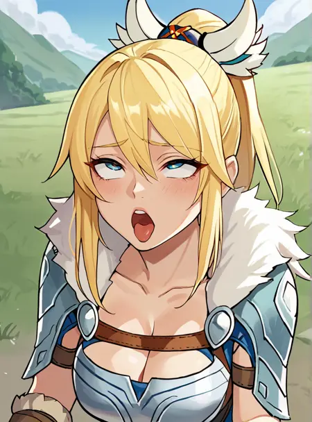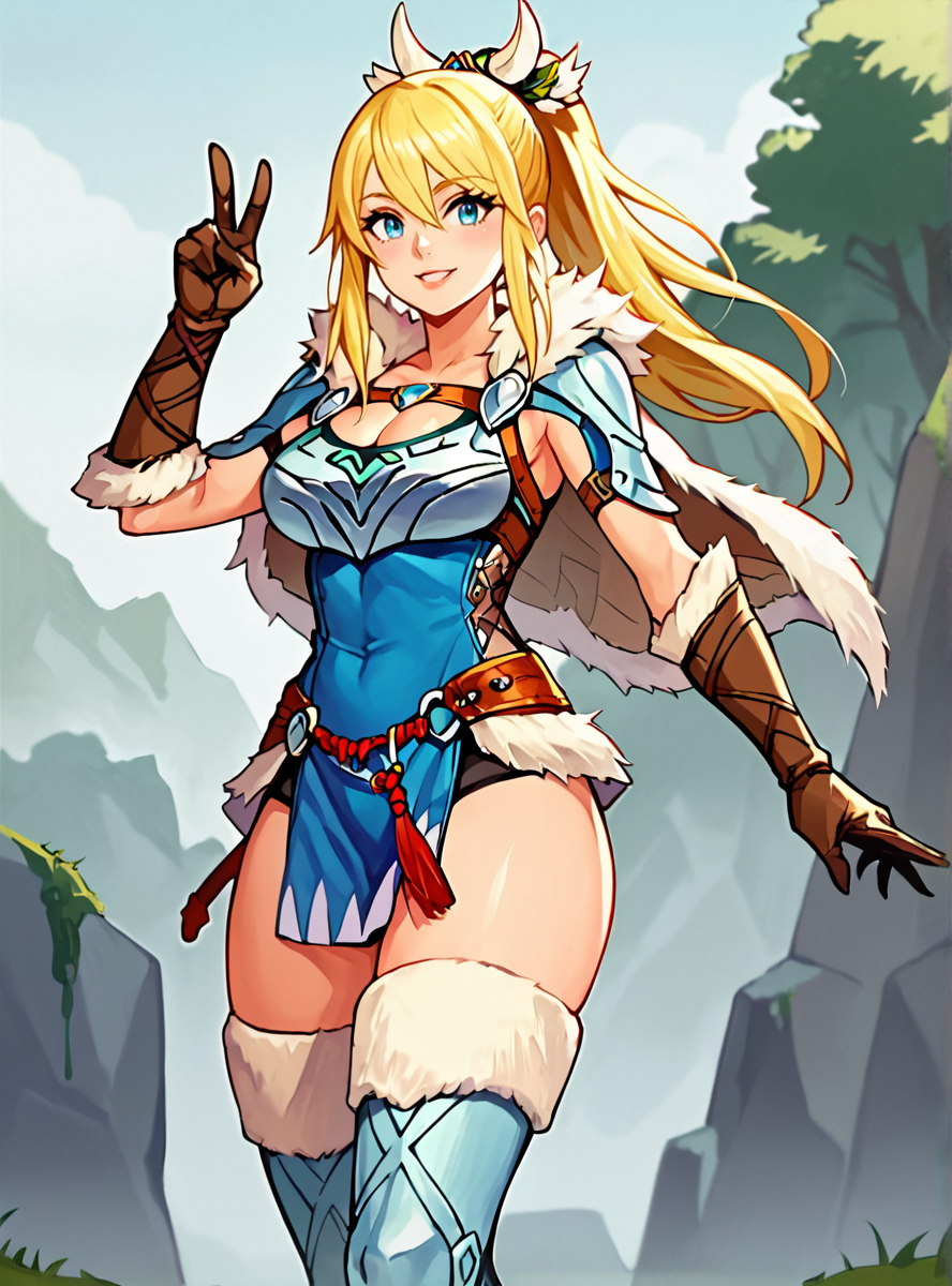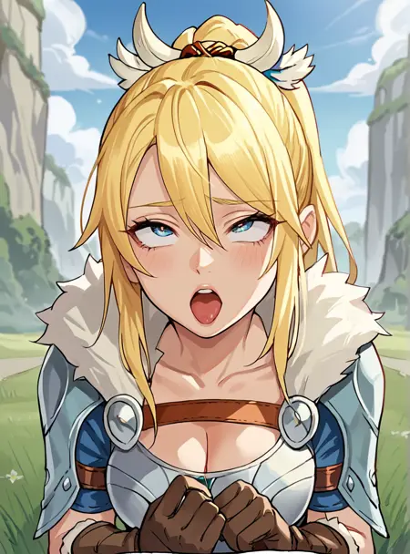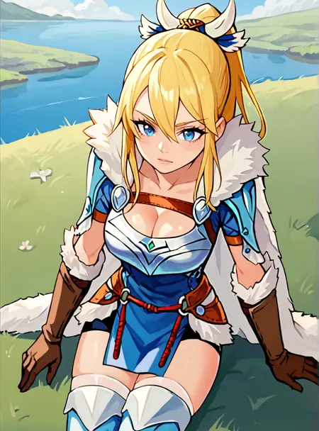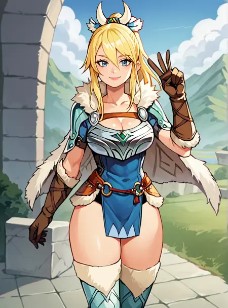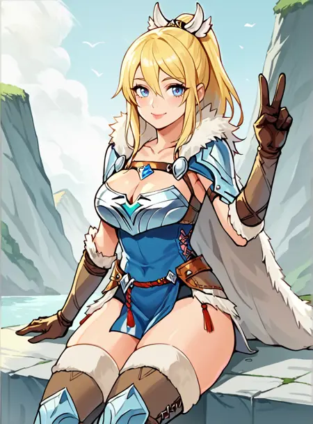 Prompts: 1girl, blonde hair, blue eyes, long hair, ponytail, armor, gloves, thighhighs, cleavage, fur trim, brown gloves,large breasts,