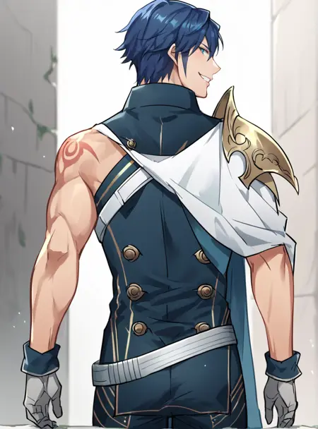 提示词:单人 1男孩,蓝发,蓝眼,斗篷,手套,盔甲,纹身,肩甲,肌肉男性,手臂纹身,