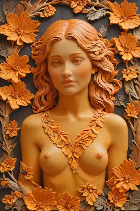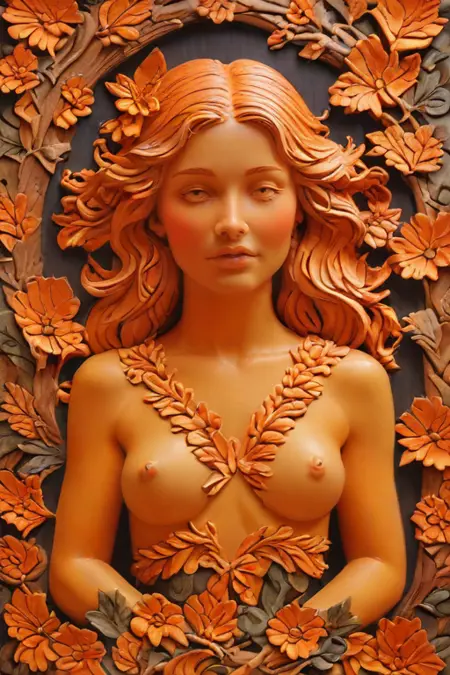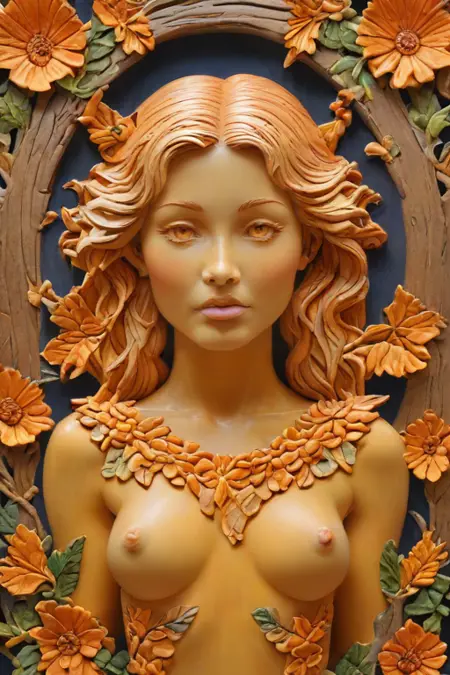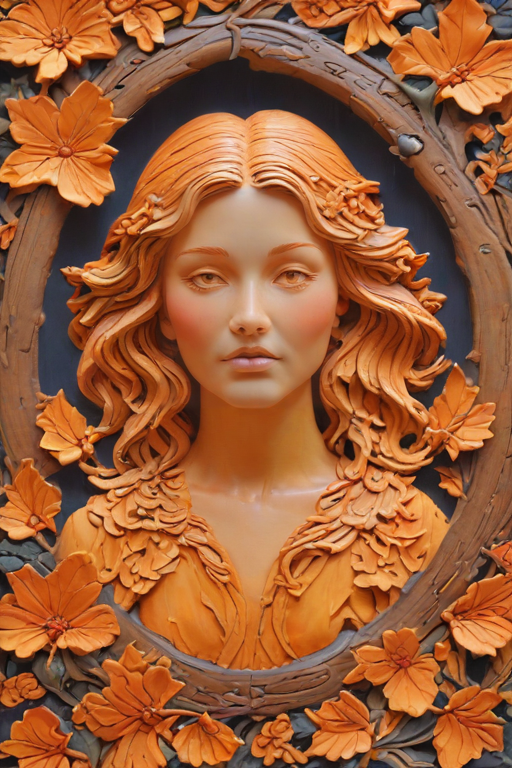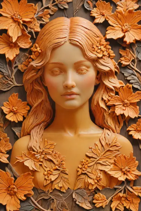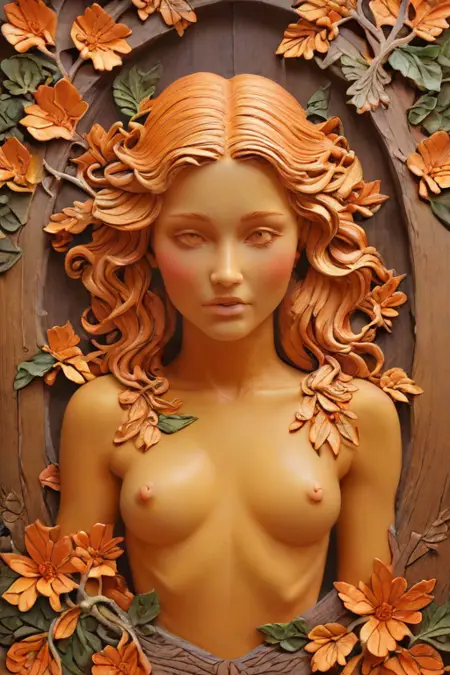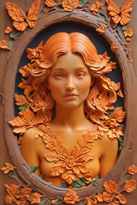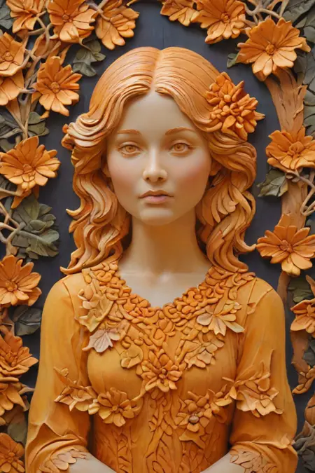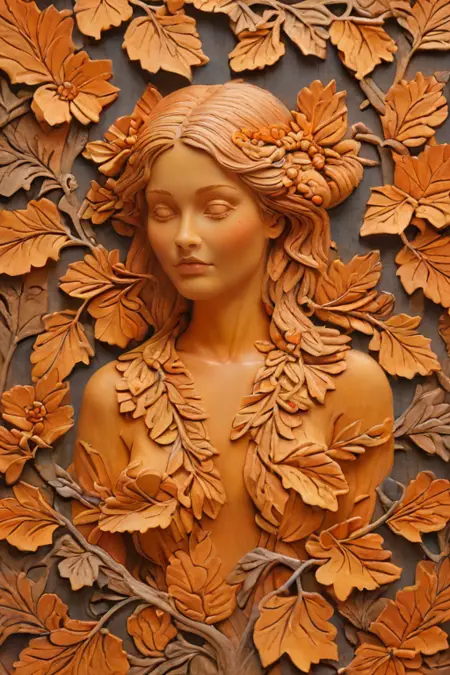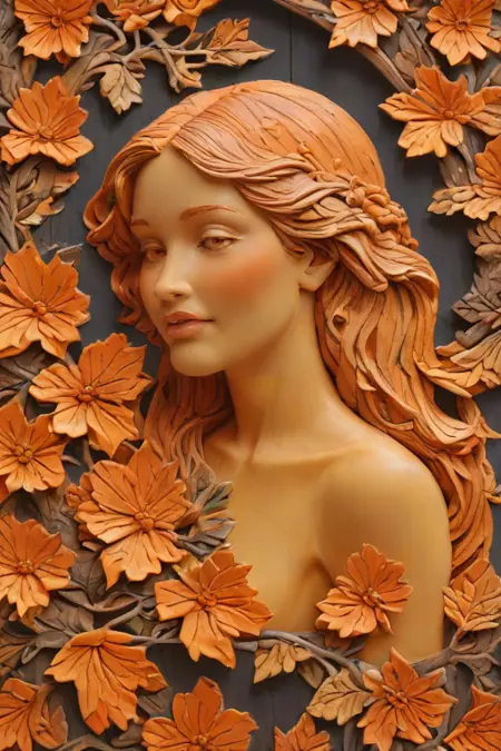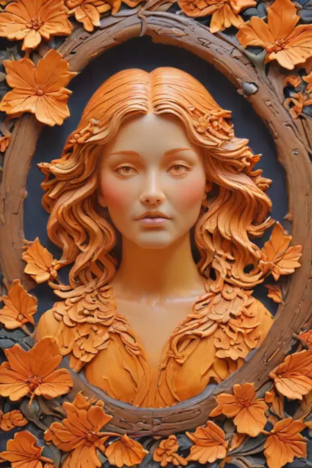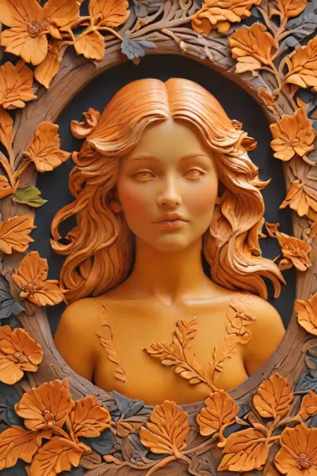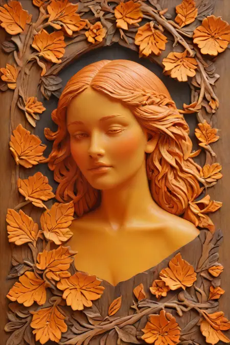 wooden carved bas-relief, the color palette is dark in colors of orange and yellow