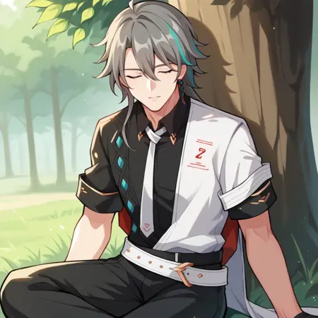 Extra Info: If you want his eyes closed: "closed eyes", if you want his eyes opened: "red eyes".