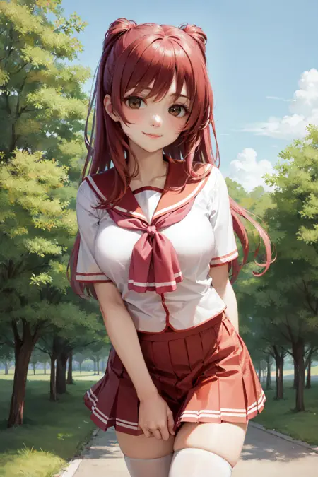 默认服装: 校服,セーラ服,红色水手领,红色领结,红色百褶裙,白色过膝袜