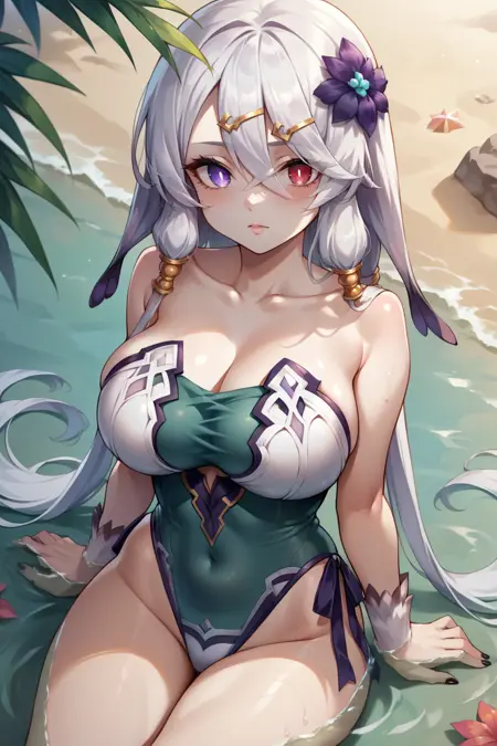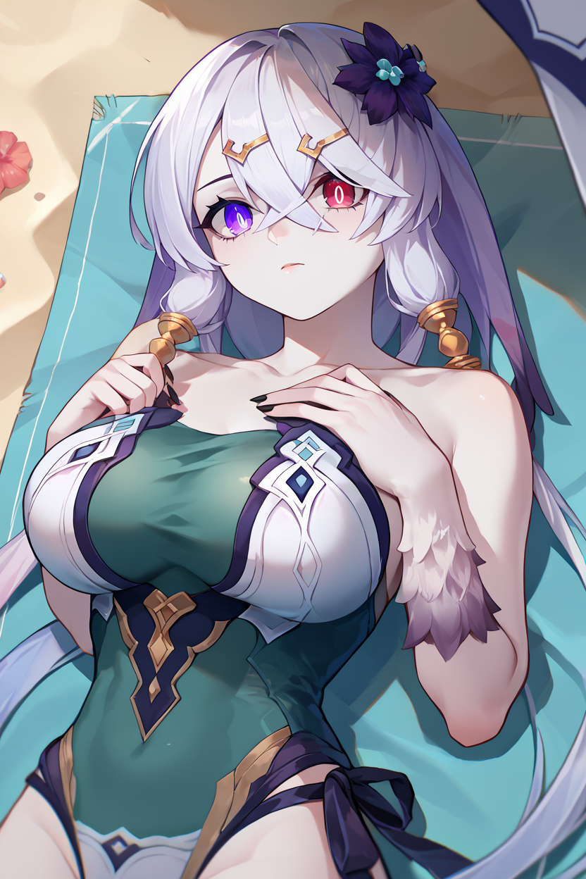 • 为她的泳装造型添加:“swimLila, 白发, 低双马尾, 非常长的头发, 交叉刘海, 异色瞳, 紫色眼睛, 红色眼睛, 苍白皮肤, 发饰, 发夹, 发饰花, 裸露肩膀, 锁骨, 青绿色连体泳衣, 毛皮, 黑色指甲”。