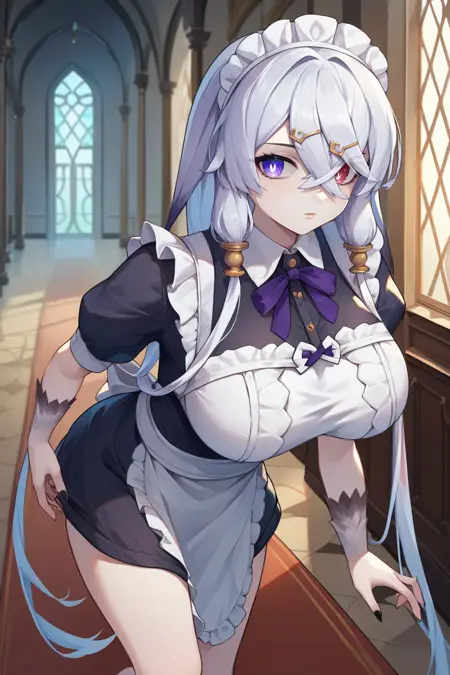 • 为她的典型造型添加:“defLila, 白发, 低双马尾, 非常长的头发, 交叉刘海, 异色瞳, 紫色眼睛, 红色眼睛, 苍白皮肤, 金色胸针, 裸露肩膀, 发饰, 金色发夹, 黑色紧身衣, 暴露胸部, 身体连衣裤, 毛皮, 戴甲腿部护具, 黑色指甲”。