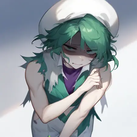 1boy, male focus, sidelocks, short hair, Green hair, white headwear, crop top, purple shirt, sleeveless, white vest, white pants