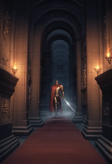 indoors, church interior, church, altar, archway, black brick wall, ornamented wall, black tile floor, tile floor, stone floor, ornamented floor, brazier, candle, candlelight, candlestand, candle stand, cathedral, ceiling light, chandelier, cloak, covered statue, statue, dark, doorway, fire, flame, fog, godhaze, hallway, ornamented altar, pillar, red candle, red carpet, red cloth, red light, roots, rubbish, rubble, ruined altar, ruins, stairs, torch, torchlight, wooden chair, wooden desk, wooden floor, wooden railway, stone railway.
