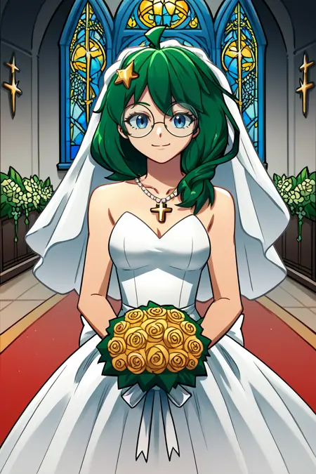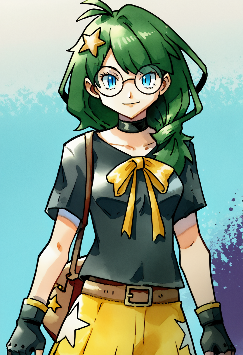 rival ivy, 1girl, green hair, blue eyes, long hair, hair over shoulder, yellow star hair ornament, ahoge, round glasses