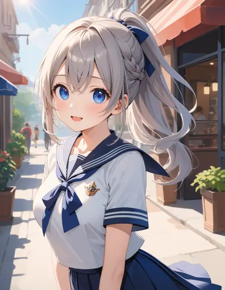 Upper body shot, Cinematic angle, A cute girl, :D, White blouse, Long sleeves, Urban park, Cute style, Watercolor, Intricate details, Extremely detailed, Outstanding intricacies, (Masterpiece:1.2), (Best quality:1.2), (Absurdres absolutely resolution:1.4)