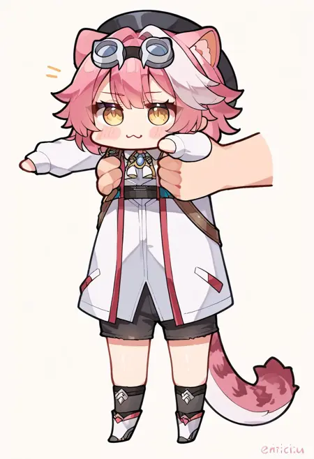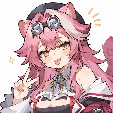 동물 귀, 꼬리, 노란 눈, 줄무늬 머리카락, 다채로운 머리카락, 고글, 모자, raora_main, 열린 재킷, 어깨 드러난, 부분적인 손가락 없는 장갑, 반지, 허벅지 스트랩, 허벅지 긴 양말,