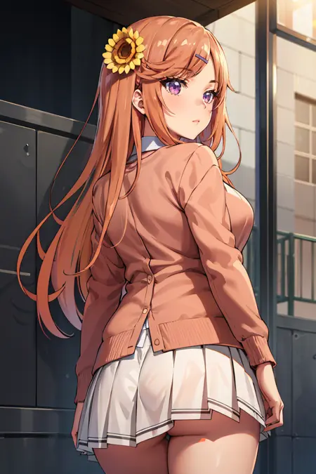 외모: asahinanazuna, 주황색 머리카락, 보라색 눈, 긴 머리카락, 해바라기 머리장식, 헤어클립