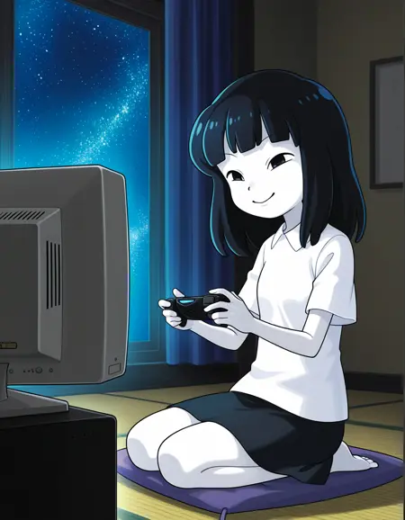 white shirt, black skirt, smile, white skin, medium hair, official art