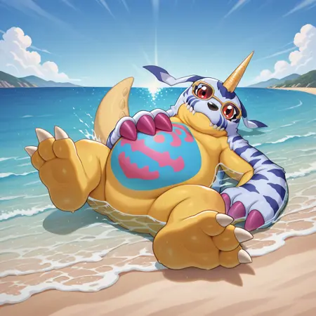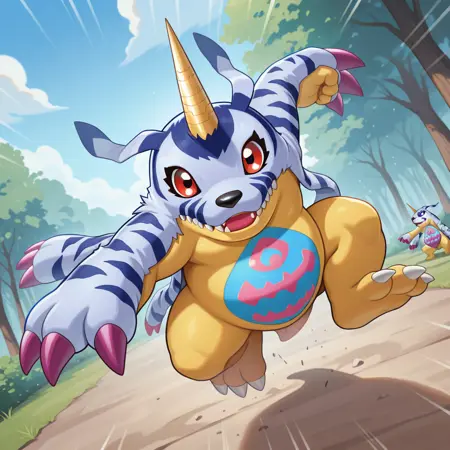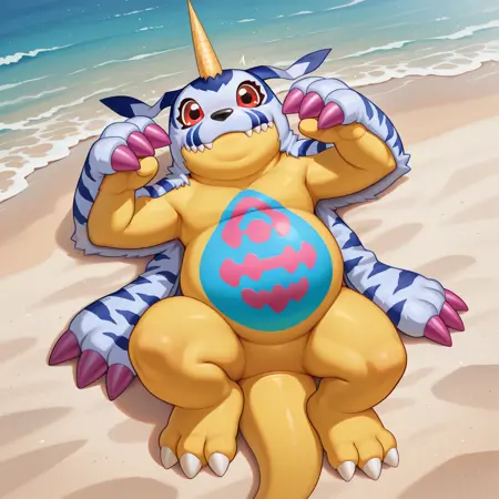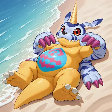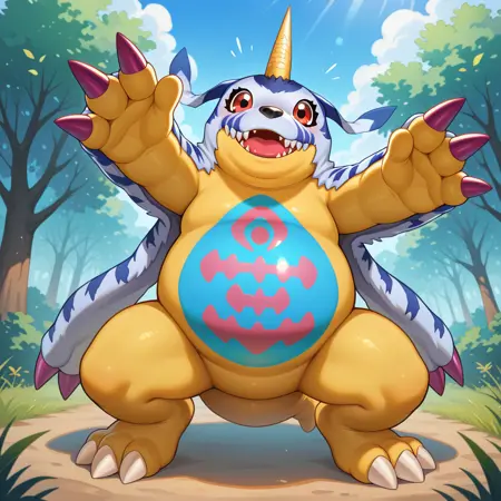 最適なプロンプト: (gabumon, digimon, single horn, claws, red eyes, sharp teeth, creature, monster, chubby, pudgy belly, blue and pink markings on belly, blue fur pelt, yellow body, three toes)