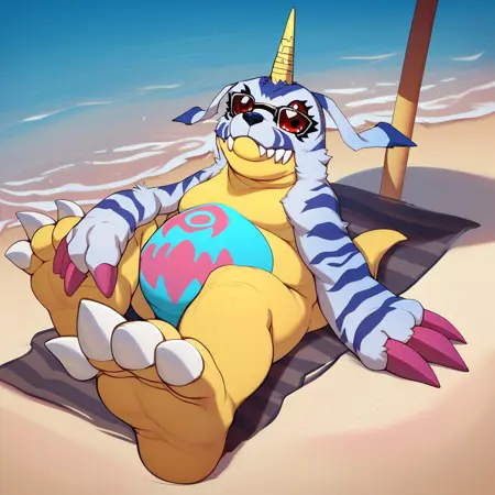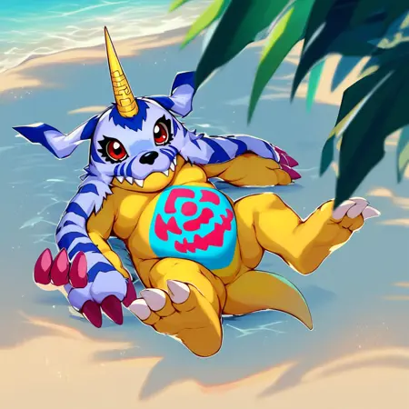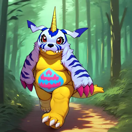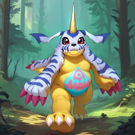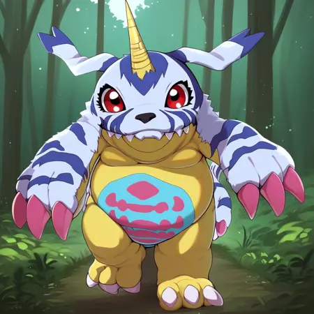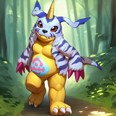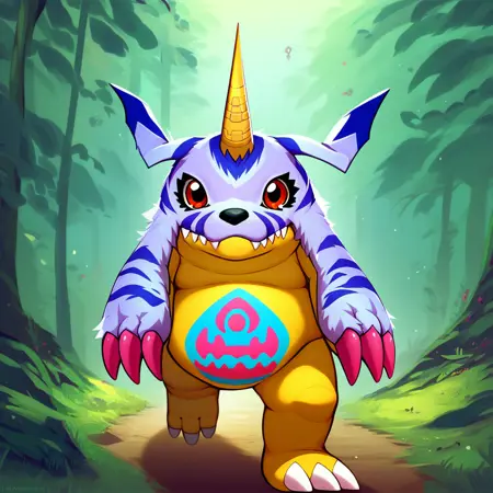 最適なプロンプト: (gabumon, digimon, single horn, claws, red eyes, sharp teeth, creature, monster, chubby, pudgy belly, blue and pink markings on belly, blue fur pelt, yellow body, three toes)