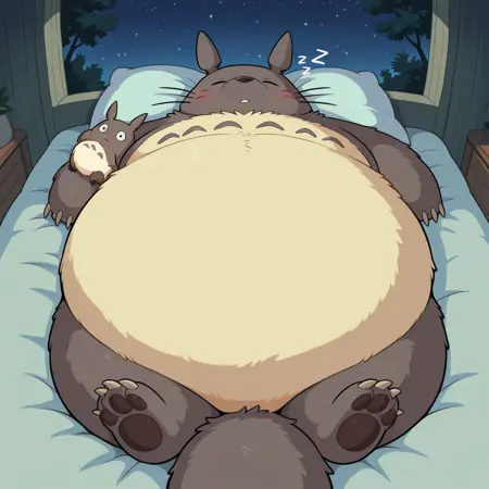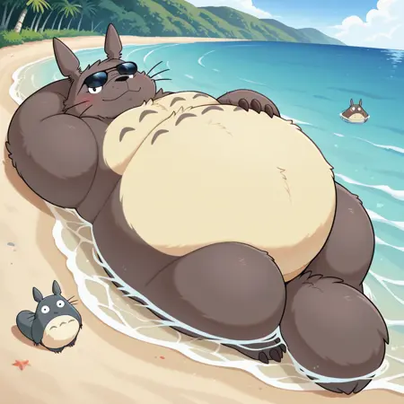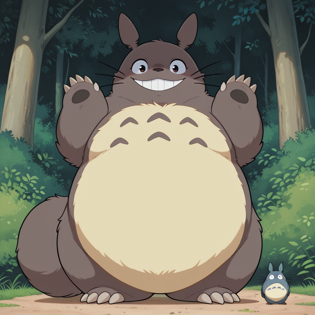 Best positive input: (totoro, studio ghibli, furry, big, fat, whiskers, grey skin, fluffy yellow belly, big smile, claws,)