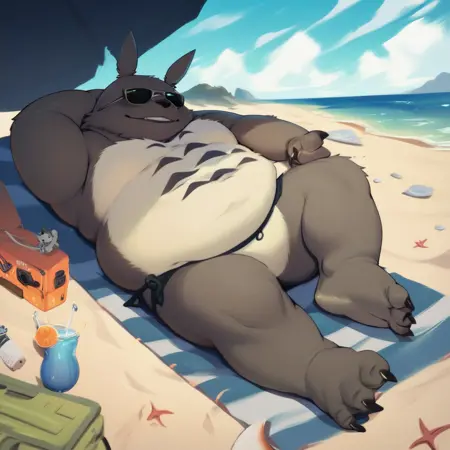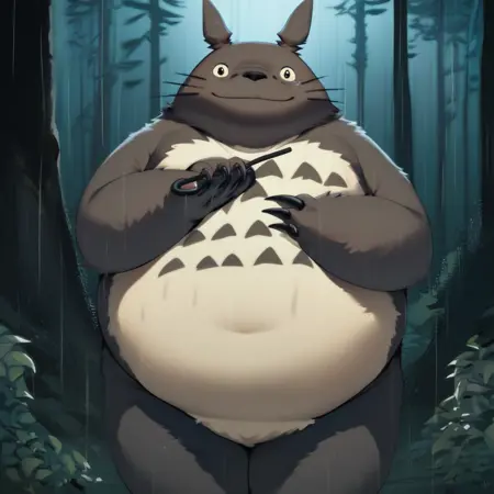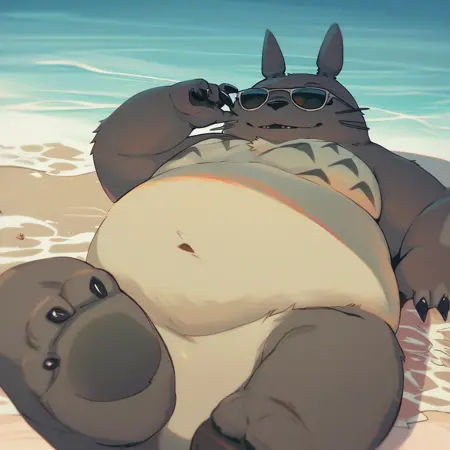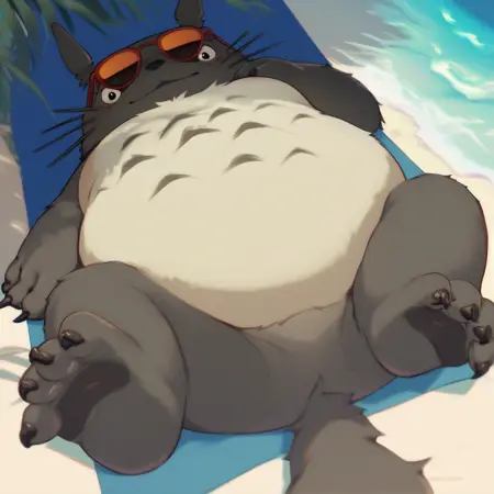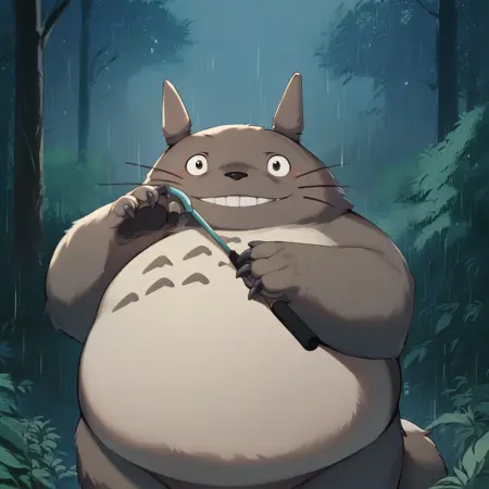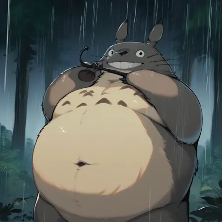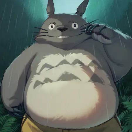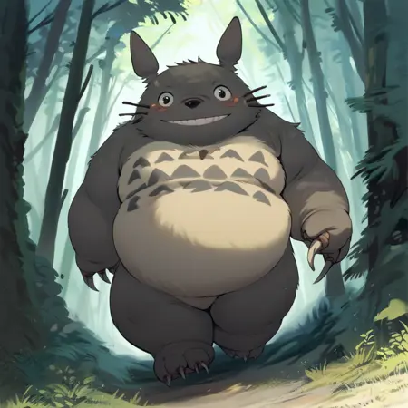 Best positive input: (totoro, studio ghibli, furry, big, fat, whiskers, grey skin, fluffy yellow belly, big smile, claws,)