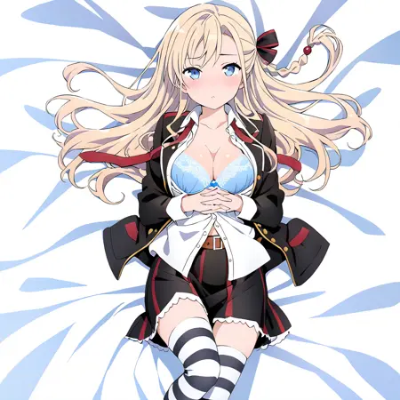 1girl, wilhelmina2, wilhel3 hair bow, wilhel3 skirt, collared shirt, wilhelmina6 jacket, wilhelmina6 belt, single braid, wilhelmina6 knee boots, red necktie, striped thighhighs,