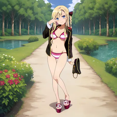 1girl, wilhelmina2, striped bikini, wilhel3 hair bow, wilhelmina6 jacket, military hat, platform footwear, open jacket, single braid,
