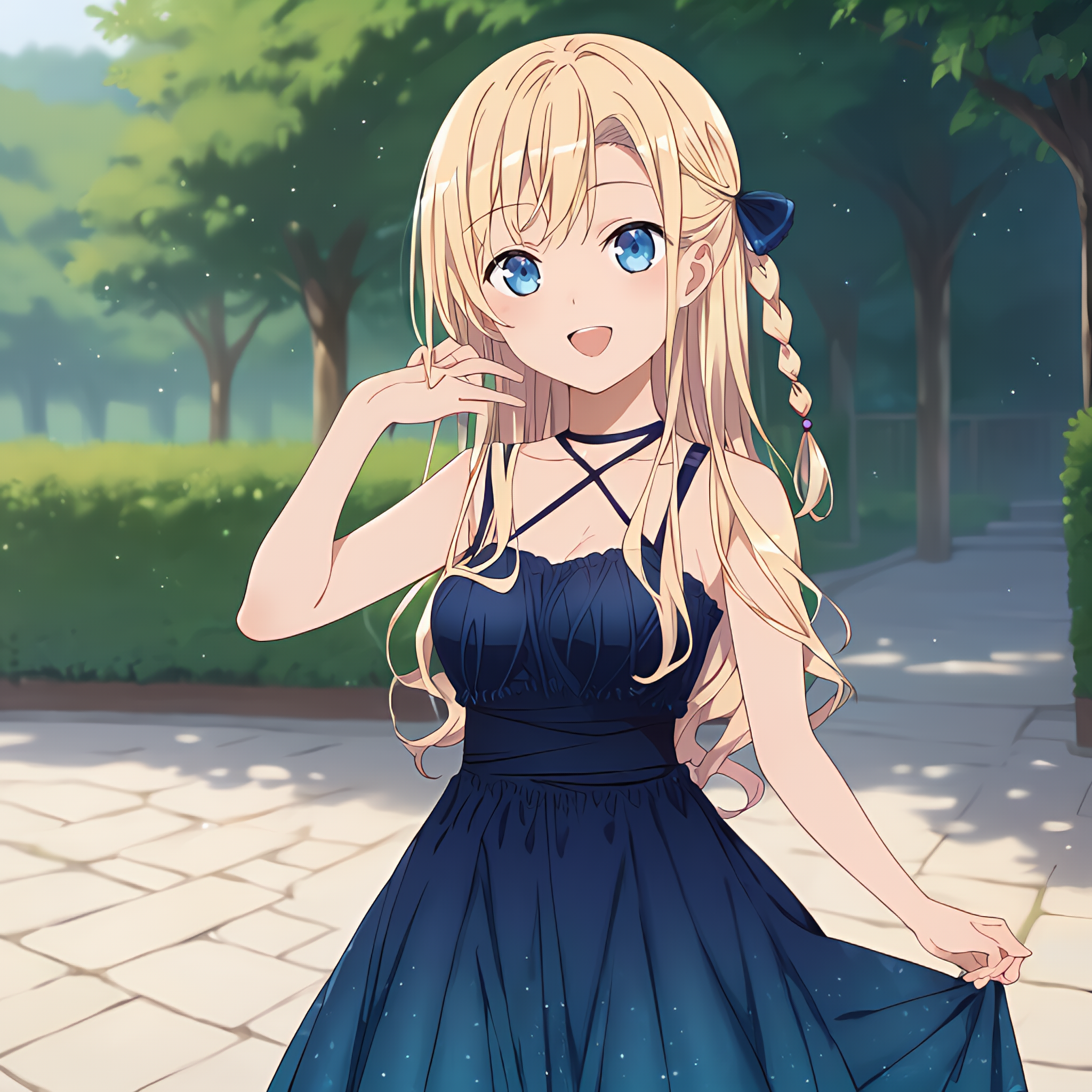 1girl, wilhelmina2, wilhelmina4 dress, blue hair bow, high heels, single braid,