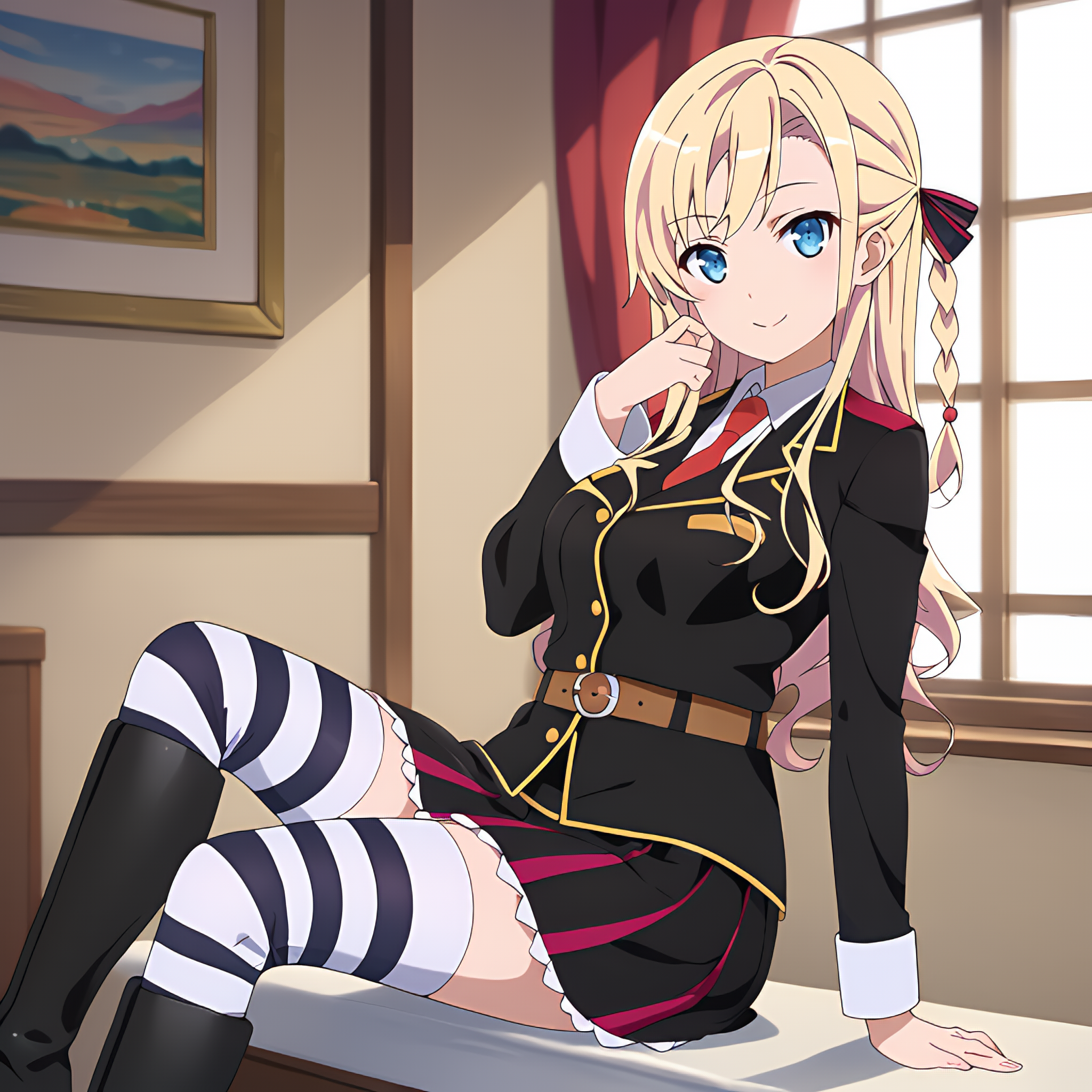1girl, wilhelmina2, wilhel3 hair bow, wilhel3 skirt, collared shirt, wilhelmina6 jacket, wilhelmina6 belt, single braid, wilhelmina6 knee boots, red necktie, striped thighhighs,