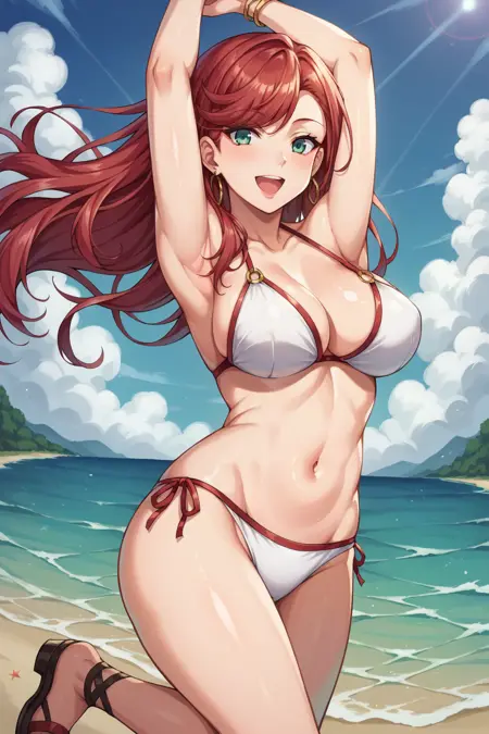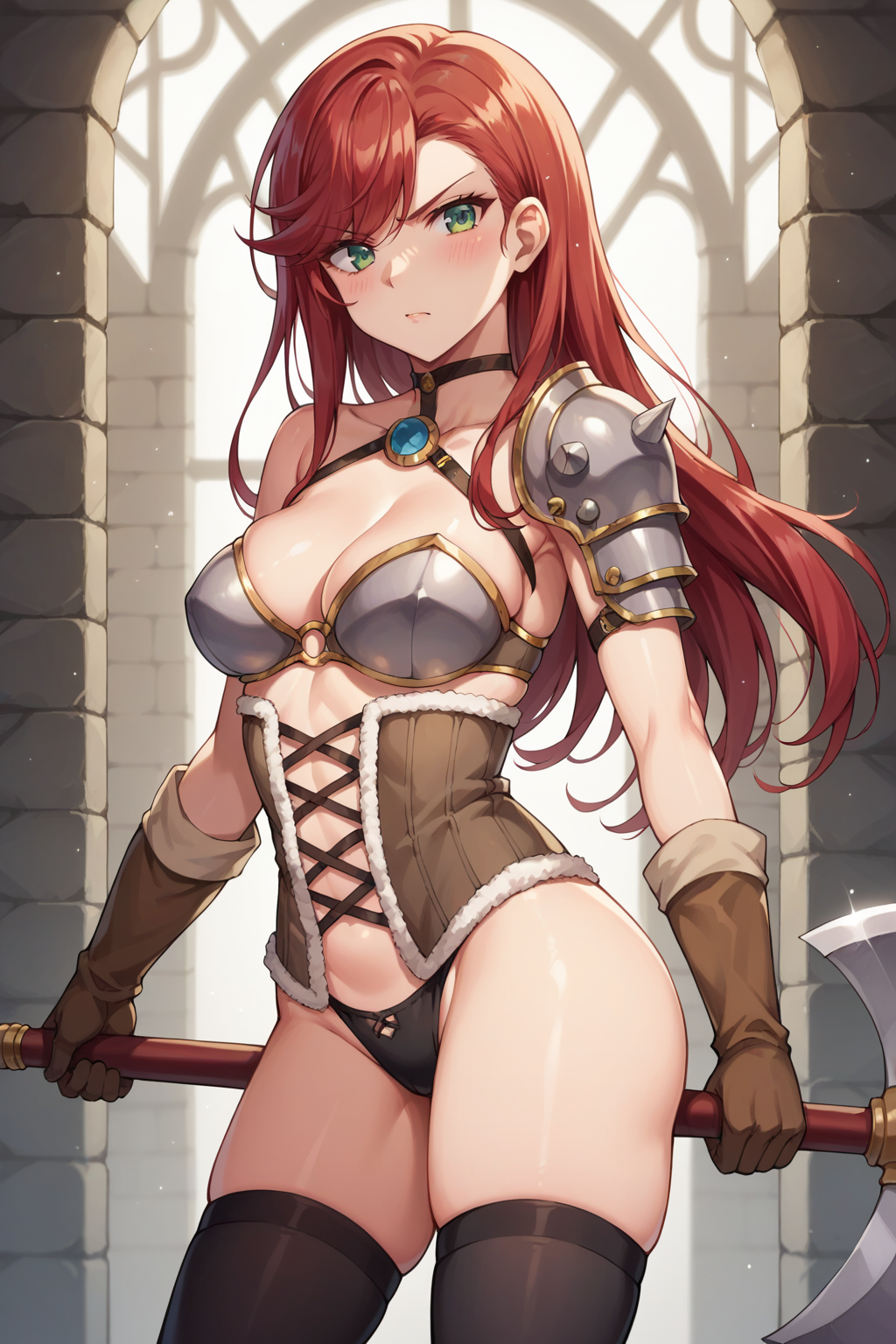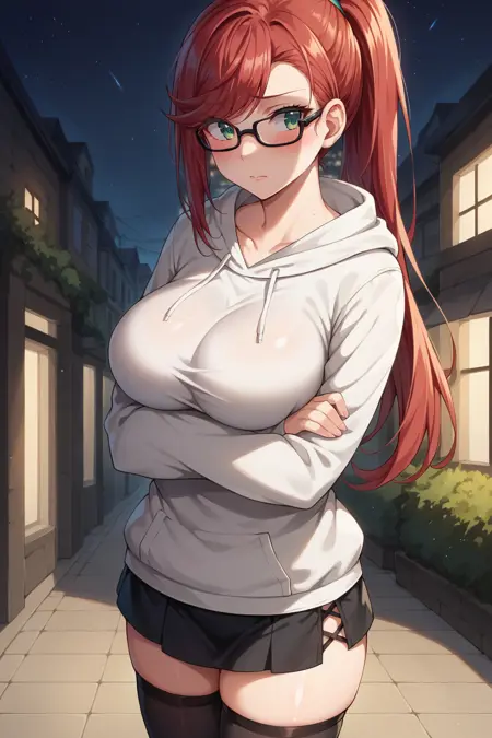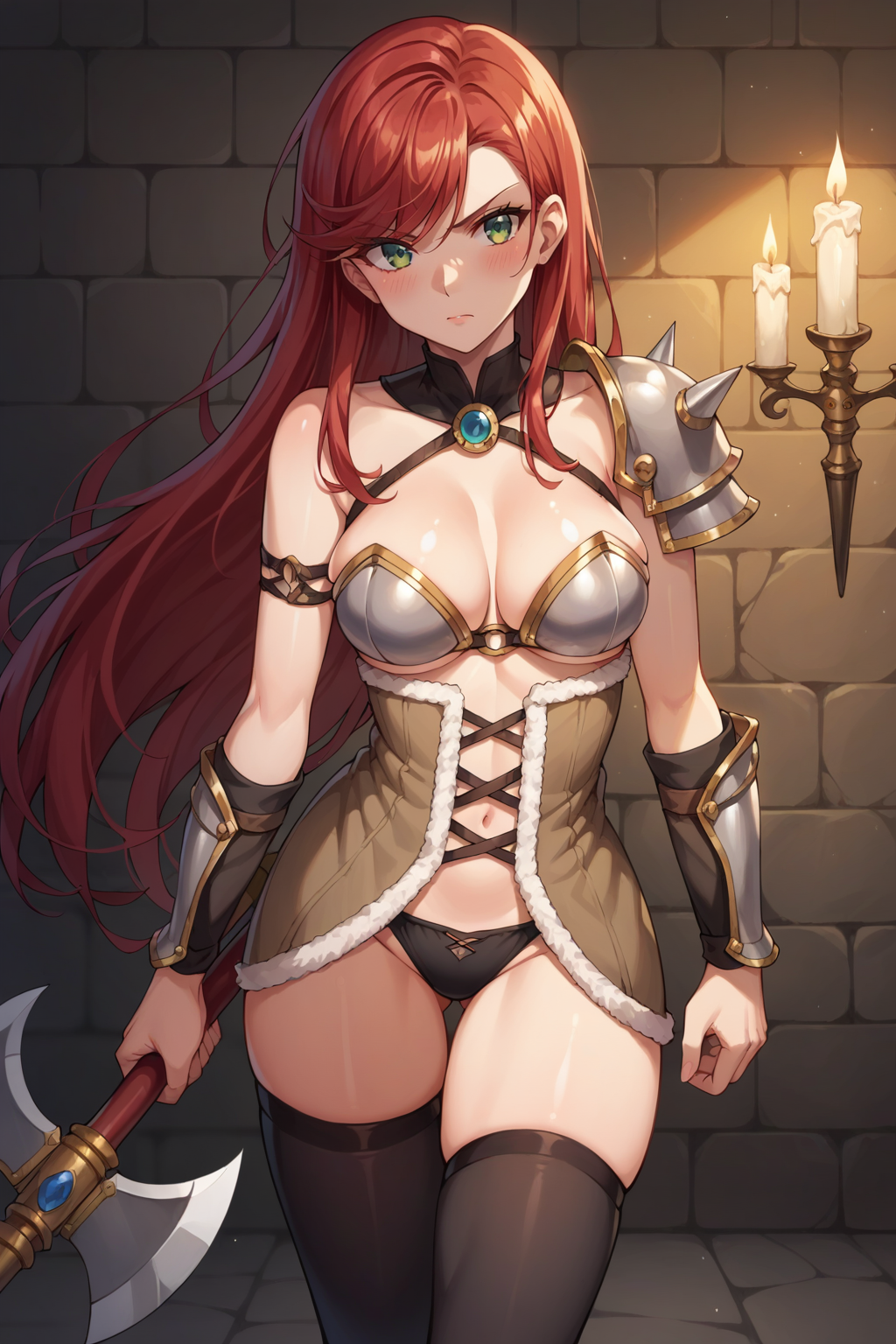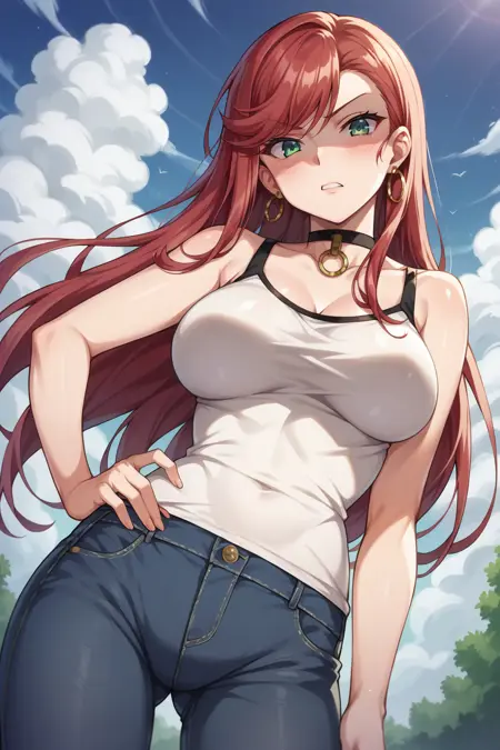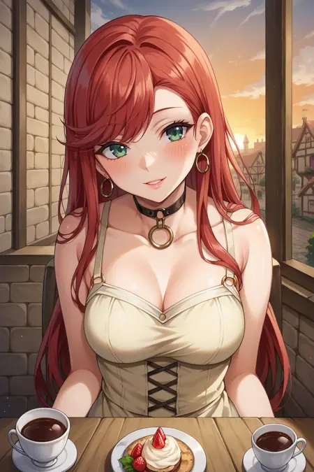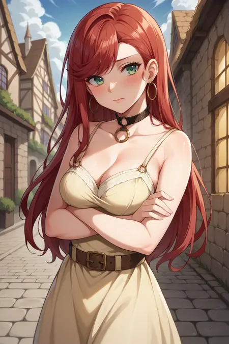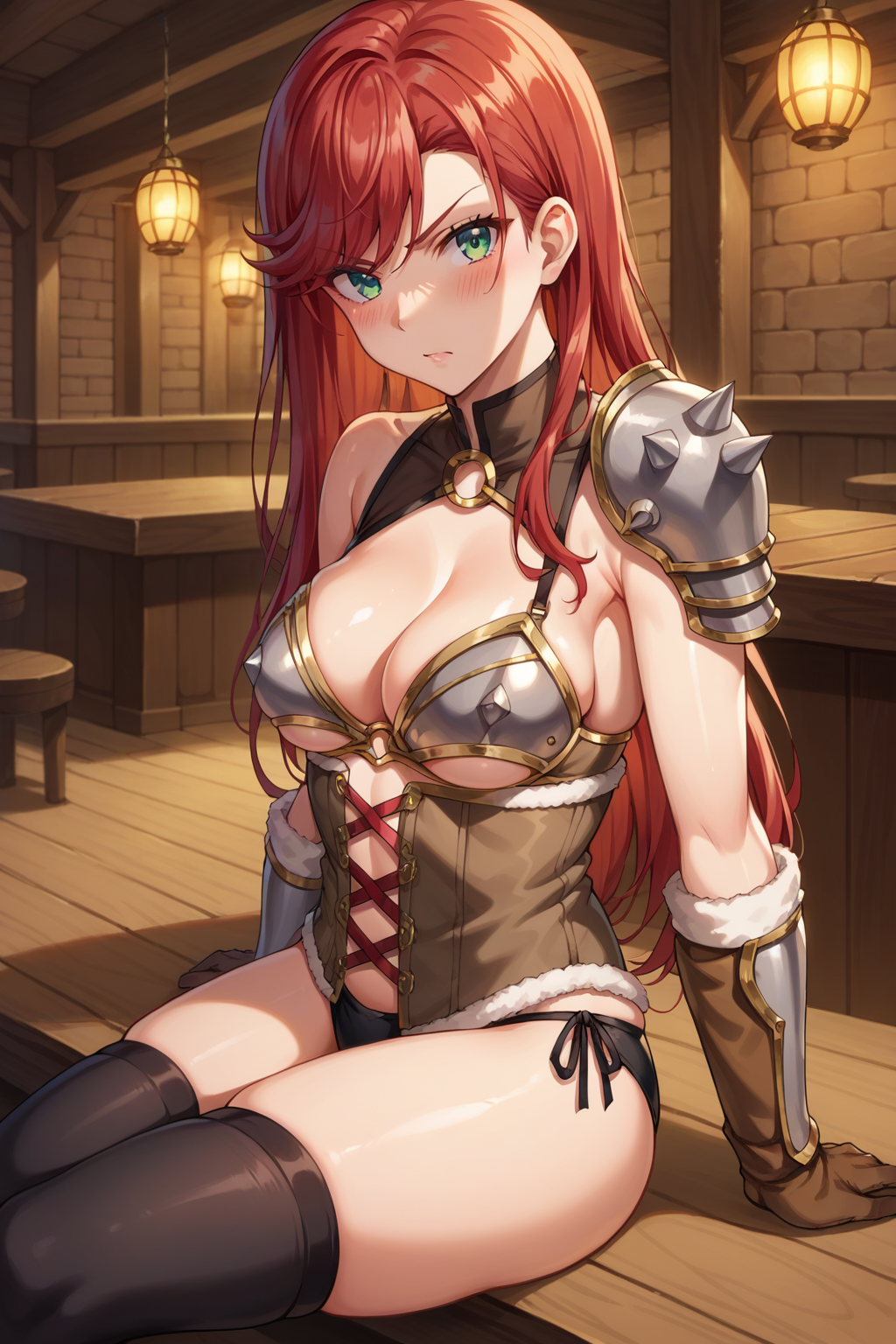 触发词: 绿色眼睛、红发、长发、斜刘海、闪亮肌肤、闪亮头发