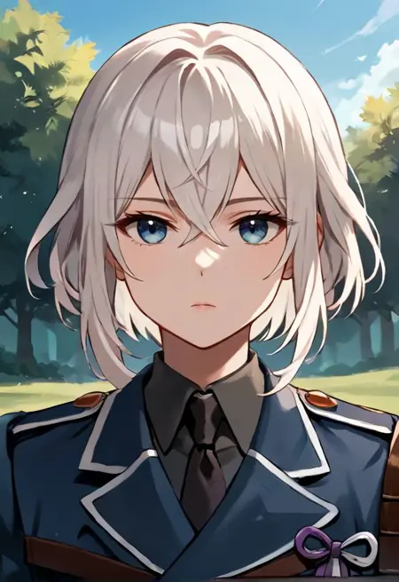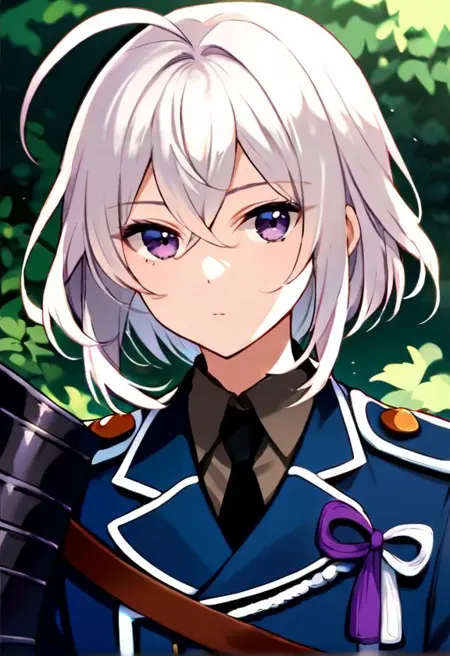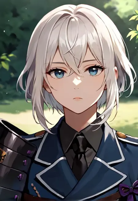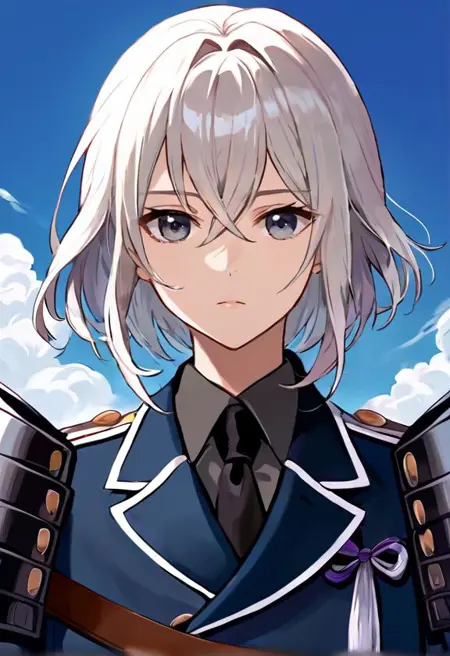 Default Outfit: default outfit, long sleeves, military uniform, shoulder armor,