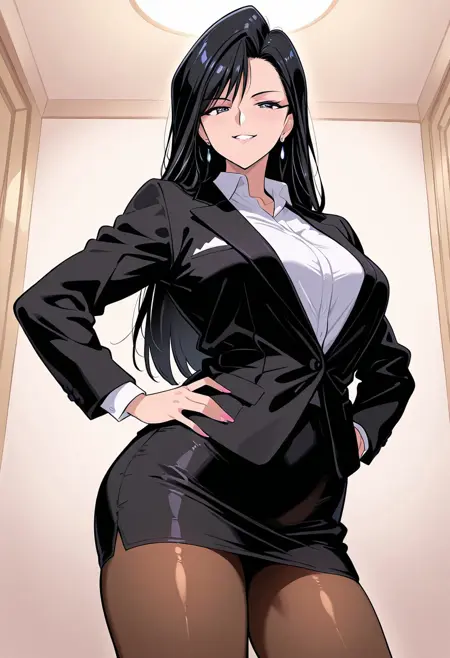 ((검은 정장 재킷, 흰색 셔츠, 섹시한 매우 투명한 갈색 팬티후스(검은 테두리, )) 검은 하이힐,