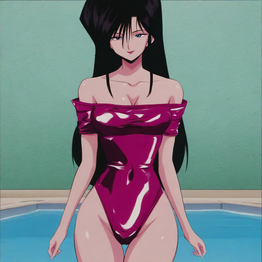 ((섹시하고 에로틱한 어깨 노출 디자인의 어두운 분홍 라텍스 수영복, 거대한 젖가슴, 저속한 젖가슴, )) 검은 렌즈 검은 프레임 선글라스,