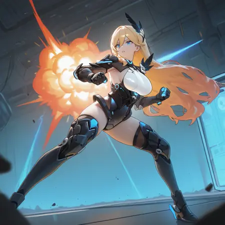 Durandal, Fol004, Du_Alt, blonde hair, blue eyes, long hair, armored leotard, halter leotard, alt covered breasts, multicolored leotard, alt black sleeves, alt long sleeves, mechanical gloves, shrug (clothing), black shrug, armpit cutout, clothing cutout, alternative thigh boots, alternate black footwear, black feathers, alt feather hair ornament, armored corset, alt black corset,