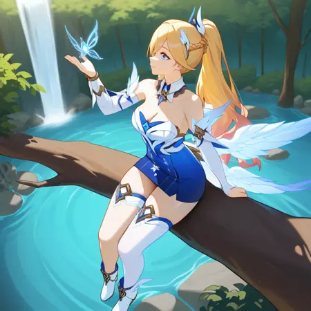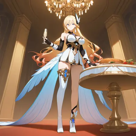 Durandal, Fol004, Du_Wht, blonde hair, blue eyes, long hair, short dress, blue dress, braid, high ponytail, alt high-waist skirt, alternate pleated skirt, pencil skirt, alt blue skirt, blue thigh strap, cleavage, alternate single thighhigh, wings, gartered thighhigh, alternative white thighhighs, alternative detached collar, necklace, alternative jewelry, different detached sleeves, alt white sleeves, single wrist guard, bare shoulders,
