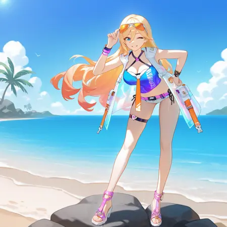 Durandal, Fol001, Du_Pur, blonde hair, blue eyes, long hair, side-tie shirt, blue shirt, cleavage, criss-cross halter, sleeveless jacket, white jacket, open jacket, see-through jacket, midriff, orange necktie, tie, micro shorts, white shorts, pink belt, o-ring thigh strap, orange-tinted eyewear, eyewear on head, sunglasses, wristband, wristwatch,