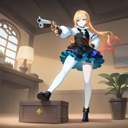 Durandal, Fol005, Du_Vnd, blonde hair, blue eyes, long hair, frilled dress, alternate black dress, puffy long sleeves, small chest, shirt under dress, alt collared shirt, alternative white shirt, alt black vest, frilled armband, frilled skirt, alt layered skirt, multicolored skirt, brown belt, wide belt, ascot, brown pouch, high collar, hairclip, alt single leg pantyhose, white pantyhose, striped pantyhose, alt asymmetrical legwear, different white thighhighs, white thigh strap,