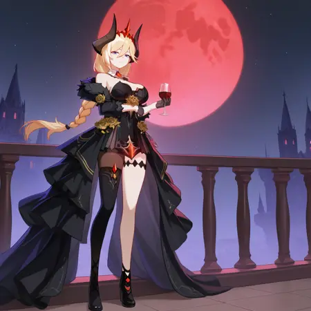 Durandal, Fol004, Du_Nib, blonde hair, blue eyes, long hair, sleeveless dress, alt black dress, between breasts, braided ponytail, alternate detached collar, white collar, red jewel, cleavage, alternative detached sleeves, black thigh strap, fur-trimmed sleeves, alternate black sleeves, alt half gloves, another black gloves, single leg pantyhose, alt black pantyhose, alt single thigh boot, alternate jewelry, gold flower, horns, horn, crown,