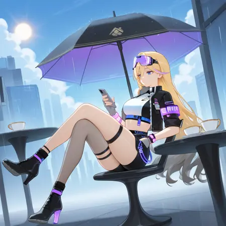 Durandal, Fol002, Du_Glh, blonde hair, blue eyes, long hair, alt gradient hair, streaked hair, crop top, two-tone shirt, black shirt, alternate white shirt, multiple belts, blue belt, waist belt, turtleneck, black belt, goggles, purple goggles, cropped jacket, alt black jacket, alt open jacket, sleeves rolled up, purple armband, red armband, alternate single fingerless glove, grey glove, short shorts, black shorts, multiple thigh straps, alt single thighhigh, brown thighhighs,