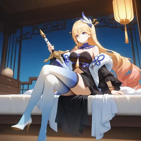 Durandal, Fol001, Du_Lpa, blonde hair, blue eyes, long hair, drill hair, chinese clothes, strapless shirt, yellow tassel, cleavage, covered collarbone, gorget, blue collar, hair ornament, white shawl, shawl, navel cutout, detached sleeves, wide sleeves, alt black sleeves, bracelet, single fingerless glove, black skirt, open skirt, fur-trimmed skirt, gradient thighhighs, white thighhighs,