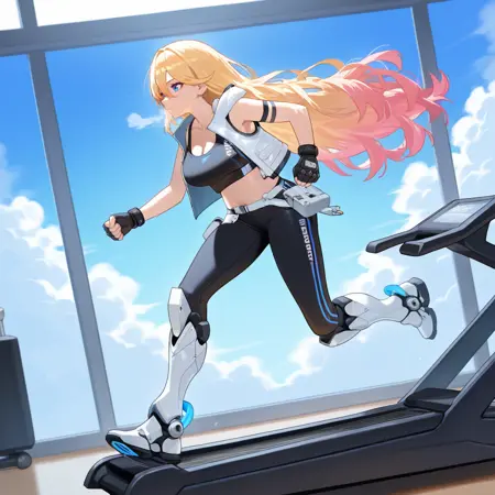 Durandal, Fol003, Du_Hgm, blonde hair, blue eyes, long hair, tank top, black tank top, midriff, black pants, yoga pants, loose belt, white belt, belt pouch, hooded jacket, white jacket, alt cropped jacket, alt sleeveless jacket, cleavage, armored gloves, alternative black gloves, alt fingerless gloves, black armband,