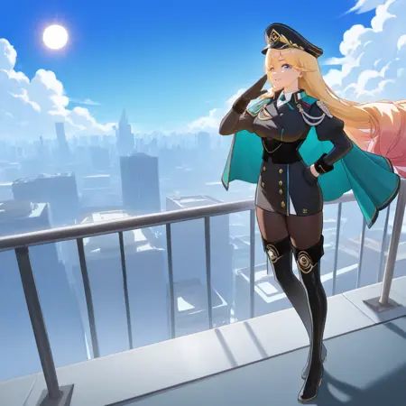 Durandal, Fol001, Du_Def,blonde hair, blue eyes, drill hair, long hair, blue eyes, military uniform, black jacket, military jacket, black uniform, corset, black corset, collared shirt, white shirt, double breasted, pantyhose, black pantyhose, thigh boots, black footwear, juliet sleeves, black sleeves, sleeves past wrists, black gloves, asymmetrical gloves, teal capelet, capelet, black headwear, military hat,