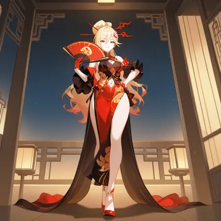 Durandal, Fol003, Du_CN, blonde hair, blue eyes, long hair, high ponytail, china dress, two-tone dress, black dress, red dress, red pelvic curtain, navel cutout, cleavage cutout, alt jewelry, alt hair flower, hair stick, alt halterneck, two-tone collar, bare shoulders, alternate detached sleeves, asymmetrical sleeves, red sleeves, black sleeves, frilled sleeves, red gloves, alt gloves, red gemstone,