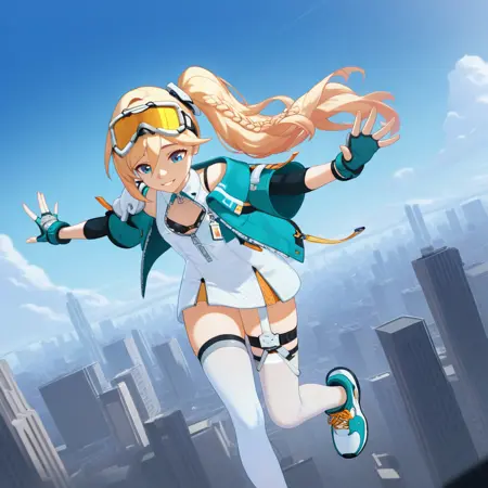 Durandal, Fol005, Du_Smd, blonde hair, blue eyes, long hair, zipper dress, alternate white dress, bra strap, small chest, side ponytail, single braid, goggles on head, orange goggles, sneakers, black bra, bra peek, collared dress, off-shoulder jacket, alternate cropped jacket, alternate open jacket, teal jacket, single pauldron, short sleeves, short over long sleeves, alternative fingerless gloves, teal gloves, another white thighhighs, single garter strap, grey thigh strap, alt gartered thighhighs,
