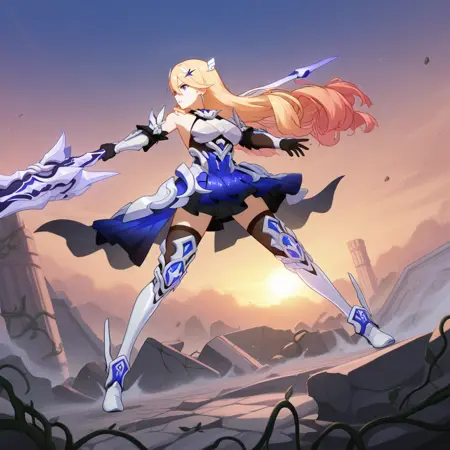 Durandal, Fol002, Du_Bke, blonde hair, blue eyes, long hair, drill hair, high-waist skirt, alt blue skirt, gradient skirt, armored skirt, alt hair ornament, clothing cutout, breastplate, halter top, bare shoulders, single earring, detached sleeves, armored sleeves, alternate black sleeves, alt black gloves, gloves, gauntlets, white gauntlets, thighhighs, alt black thighhighs, armored boots, white footwear, alternate thigh boots,