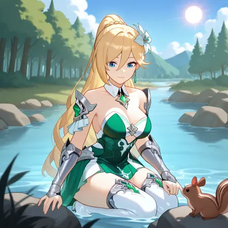 Durandal, Fol002, Du_Emr, blonde hair, blue eyes, long hair, strapless dress, green dress, white bra, two-tone skirt, white skirt, green skirt, shoulder armor, silver gauntlets, alt gauntlets, high ponytail, green earring, hair flower, green gem, gem, detached collar, collared collar,