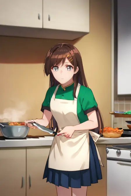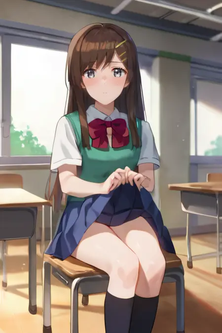 Prompts I use for character: hibiki, long hair, brown hair, ponytail/straight hair, grey eyes, hair ornament, hairclip