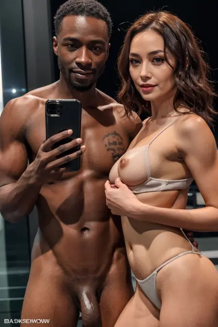 lora:slfeass:0.8, slfeass, 1girl, 1boy, ass, looking at viewer, holding, navel, sitting, nipples, hetero, nude, parted lips, huge penis, {indoors, |} lips, {pubic hair,|||} muscular, facial hair, erection, phone, muscular male, pectorals, cellphone, {male pubic hair,|} smartphone, holding phone, reflection, {ass grab,|} mirror, realistic, interracial, selfie, bathroom, {dark-skinned male,|}