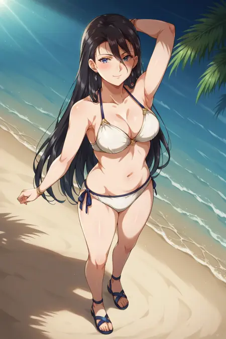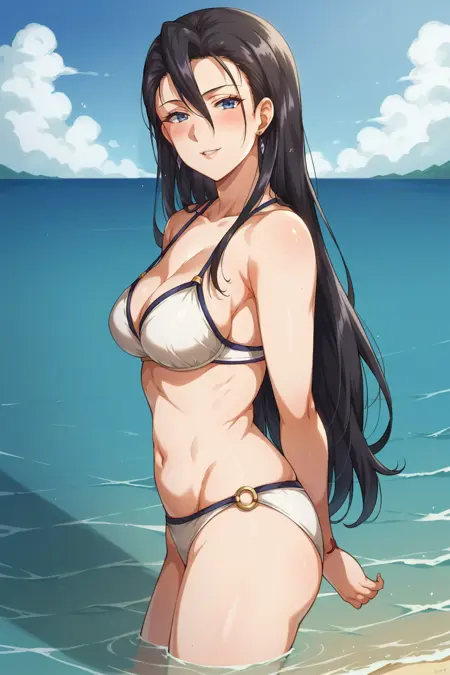 트리거: 짙은 파란 눈, 검은 머리, 긴 머리, 성숙한 여성, 눈 사이의 머리카락